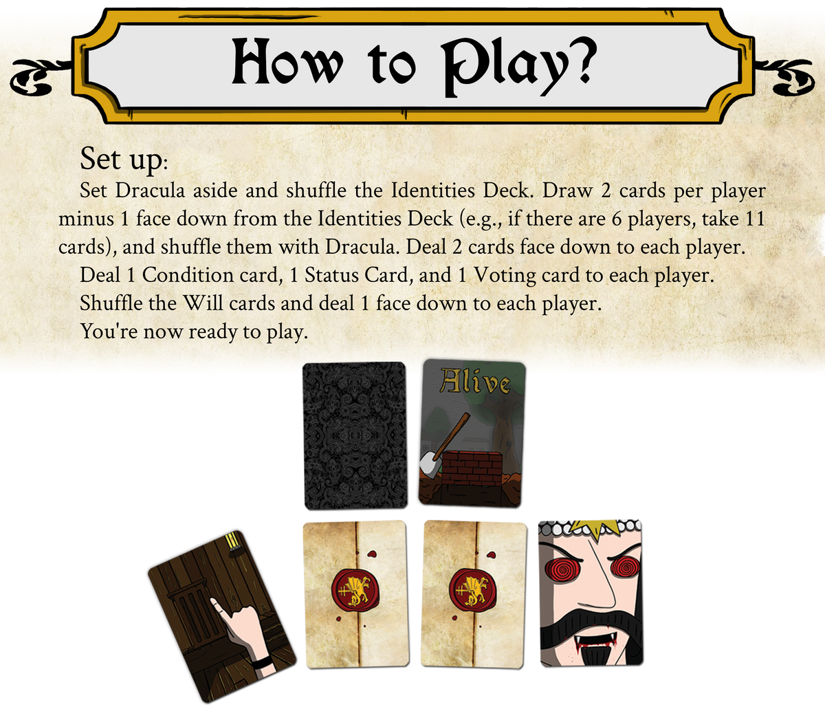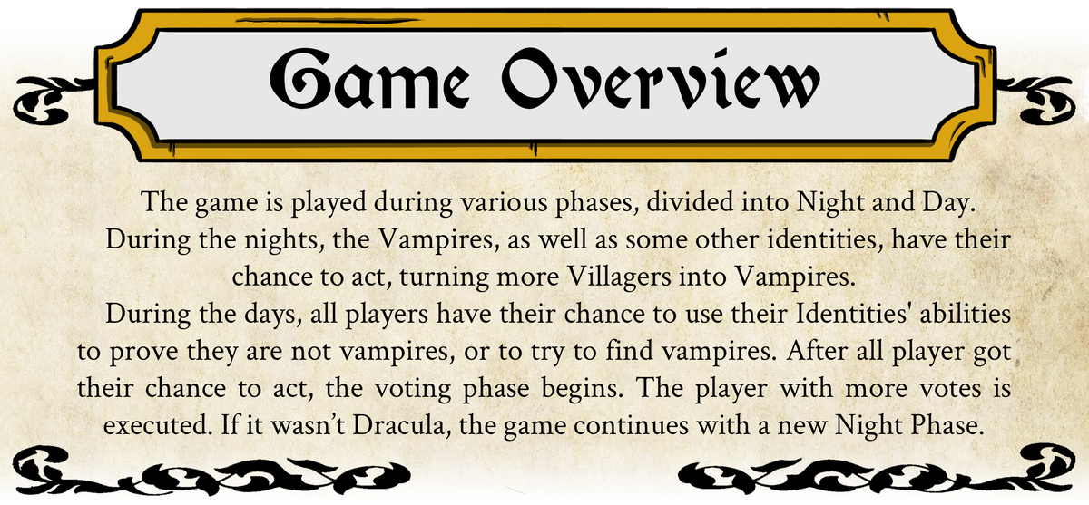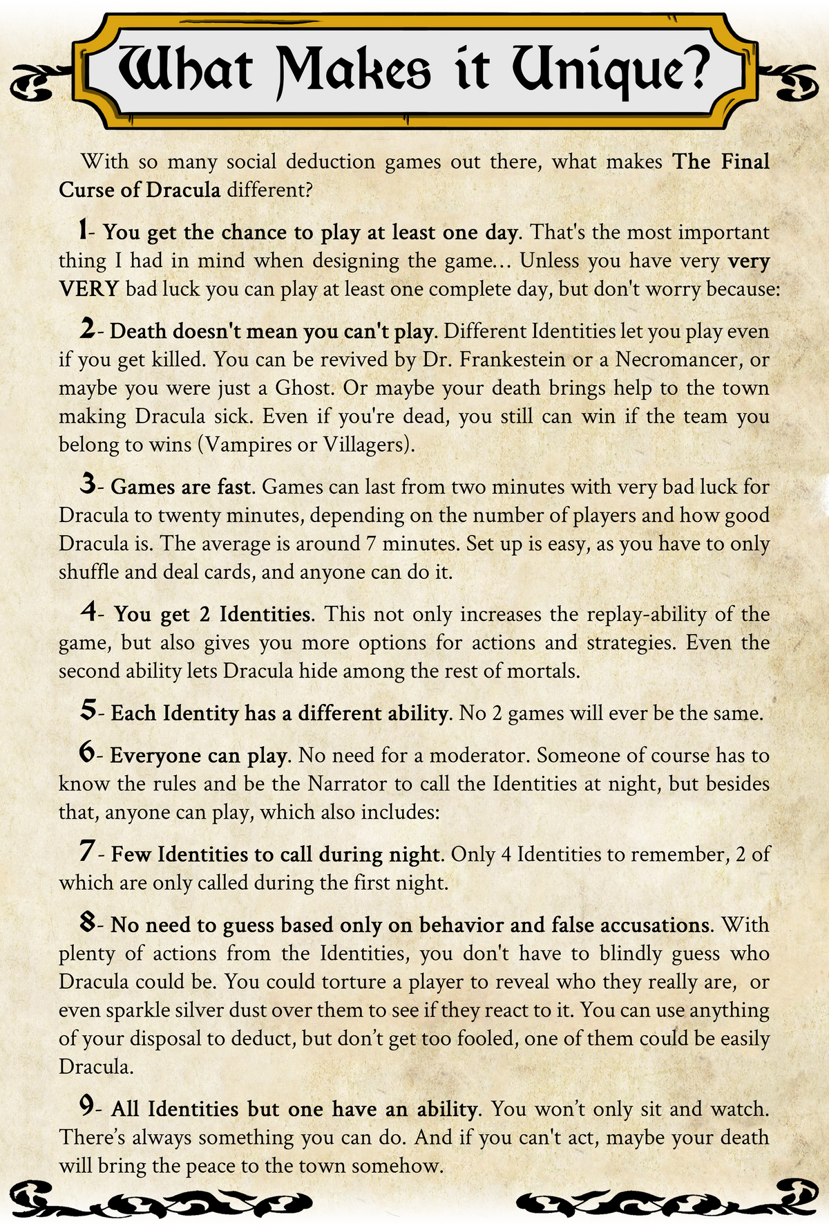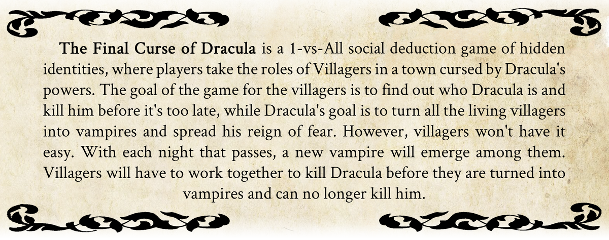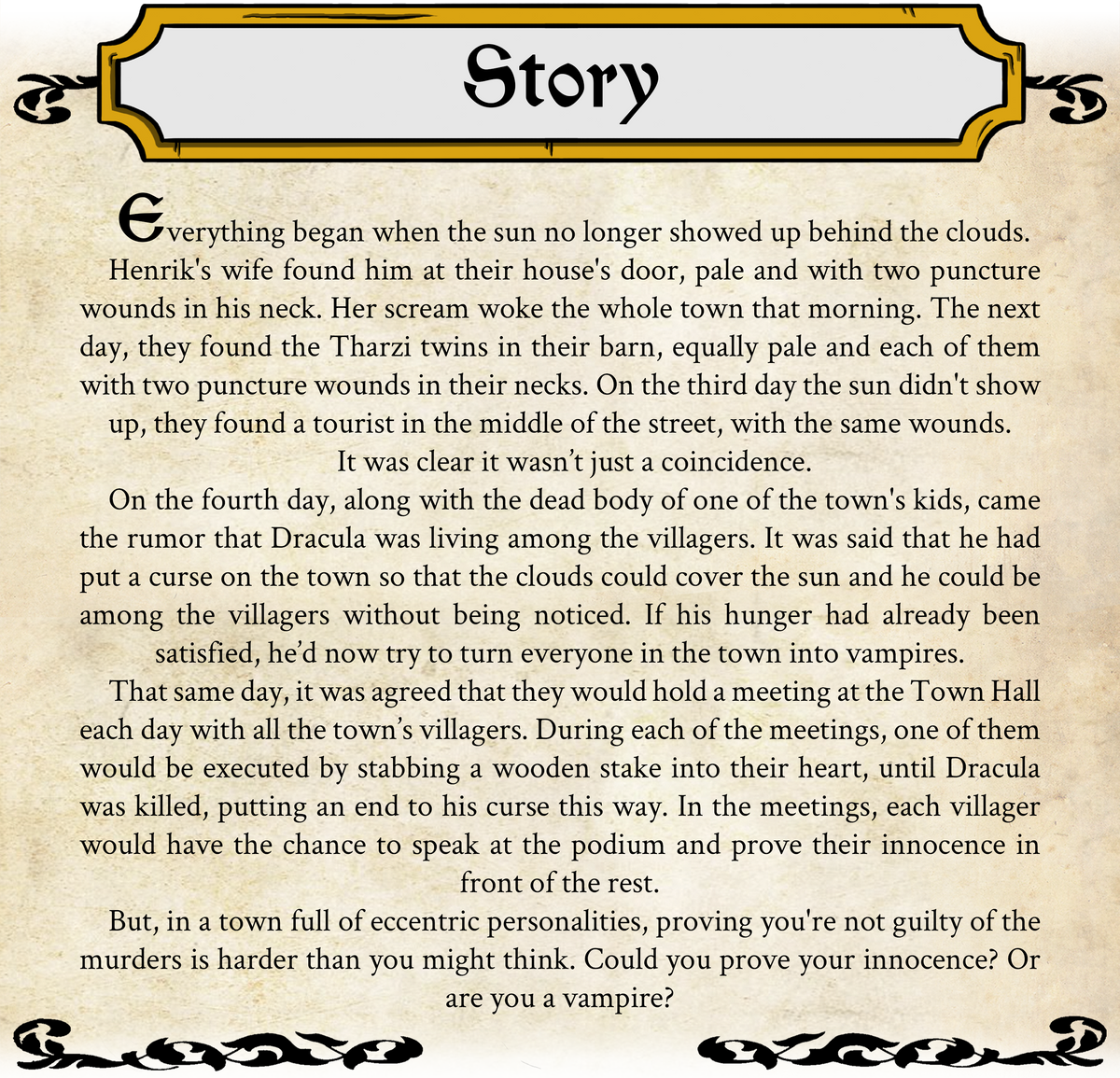 A 1 vs All party game of hidden roles where you have to find out who Dracula is and kill him before he turns everyone else into Vampires.